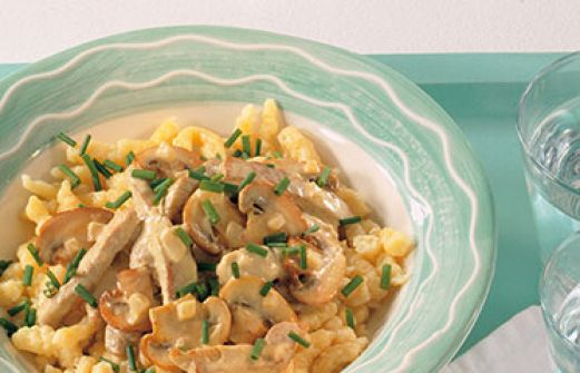 Spätzle mit Fleisch-Pilz-Sauce Zutaten 400 g Schweineschnitzel oder Hähnchenbrustfilet 200 g Champignons 1 Zwiebel 2 Knoblauchzehen 2 EL Öl 1/8 l Hühner- oder Gemüsebrühe 150 g Sahne 1/2 TL scharfer Senf Salz Pfeffer 400 g Spätzle 2 EL Schnittlauchröllchen guk:simila [...]
