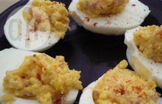 Portionen : 4 4 halbierte hartgekochte Eier 8 EL Mayonnaise 2 EL kleingeschnittener Räucherlachs 2 EL geriebener Käse Zub.: 10 Min. | Kochzeit: 15 Min. 1. Eigelb aus den Eiern nehmen und mit der Gabel zerdrücken. Mit Mayonnaise verrühren. Die Masse in 2 Por [...]