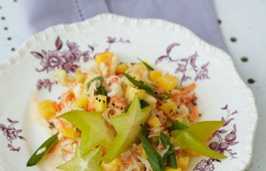 Sauerkrautsalat mit Früchten Zutaten 250 g mildes frisches Sauerkraut 200 g Möhren 1 Frühlingszwiebel 50 g Sahne 2 EL Honig 2-3 EL frisch gepresster Zitronensaft 2 EL Rapsöl 1 säuerlicher Apfel (z. B. Boskop, Braeburn) 100 g frisches Ananasfruchtfleisch 1 Sternfrucht (Karam [...]
