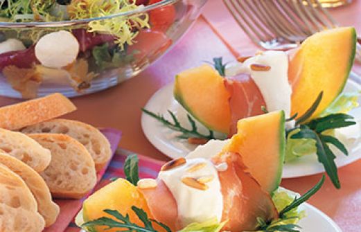 Melonen mit Schinken Zutaten 1 große Zuckermelone (z. B. Ogen-, Netz- oder Charantais-Melone) 1 kleiner Kopf Eisbergsalat 1 Hand voll Rucola 200 g geräucherter Schinken in dünnen Scheiben 1 unbehandelte Zitrone 400 g Sahne 1 Prise gemahlener Koriander Salz schwarzer Pfeffer [...]