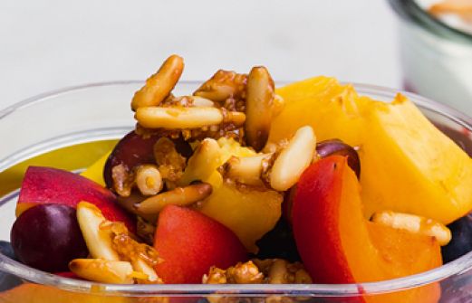 Obstsalat mit kandierten Pinienkernen Zutaten 1/2 Ananas 300 g nicht zu weiche Aprikosen 2 Nektarinen 300 g kernlose weiße oder blaue Weintrauben 1 Limette 2 TL flüssiger Honig 50 g Pinienkerne 1 TL brauner Zucker 100 g Heidelbeeren guk:similarity-keywords=""> 1/2 Ana [...]