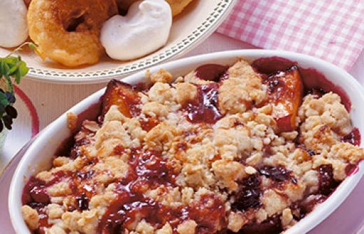 Pflaumen-Crumble Zutaten 750 g blaue Pflaumen oder Zwetschgen 1 EL Puderzucker 1 Msp. Zimtpulver 120 g Mehl 1/2 TL Backpulver 2 EL Zucker 1 EL Vanillezucker 2 EL Kokosraspel 2 EL Haferflocken 80 g kalte Butter + Butter für die Form guk:similarity-keywords=""> 750 g b [...]