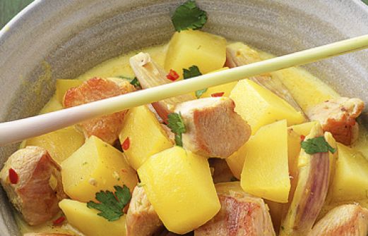 Kartoffeln und Hähnchen in Kokosmilch Zutaten 1 Stange Zitronengras 1 Stück frischer Ingwer (etwa 4 cm) 2 rote Chilischoten 1 Bio-Limette 2 TL gemahlene Kurkuma 600 g festkochende Kartoffeln 6 Schalotten 500 g Hähnchenbrustfilet 2 EL Öl 400 ml Kokosmilch Salz Korianderblä [...]