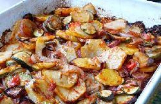 Portionen : 4 1 kg Kartoffeln, geschält und in 3 mm dicke Scheiben geschnitten 4 grosse Zucchini, in 3 mm dicke Scheiben geschnitten 4 mittelgrosse rote Gemüsezwiebeln, in 3 mm dicke Scheiben geschnitten 6 frische Eiertomaten, püriert 125 ml Olivenöl 2 EL frische Pete [...]