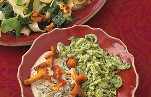Spätzle mit Pilzragout Zutaten 100 g TK-Spinat (aufgetaut) 3 Eier Salz frisch gemahlener Pfeffer frisch geriebene Muskatnuss 325-350 g Mehl 800 g Pfifferlinge 2 Schalotten 2 EL Butterschmalz 50 ml trockener Sherry (oder Gemüsefond) 200 ml kräftiger Gemüsefond 200 g Sahne [...]