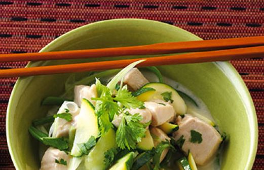 Hähnchen mit Kokosmilch Zutaten 2 Hähnchenbrustfilets (à 150 g) 4 Frühlingszwiebeln 2 kleine Zucchini 3 Zweige frische Minze (ersatzweise Basilikum) 150 ml Kokosmilch 1 EL helle chinesische Sojasauce 1 TL Honig 2 EL Rapsöl Salz Pfeffer 1 EL fein geschnittenes Koriandergrü [...]