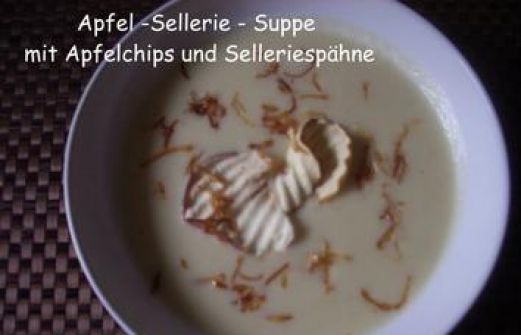 zutaten_2sp"> Zutaten für Personen Rezept mit Bild: Apfel - Sellerie - Süppchen mit Calvados Bild einstellen 2 Apfel Boskop 600 g Sellerieknolle 300 g Kartoffeln 1 Zwiebeln frisch 750 ml Geflü [...]