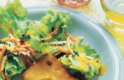 Gebackener Emmentaler mit Salat Zutaten 200 g Möhren 200 g Sellerie 3 EL Essig 1 TL Senf Salz Pfeffer 1 EL Petersilie (gehackt) 4 EL Öl 150 g Blattsalat 4 Scheiben Schweizer Emmentaler (á 100 g) 3 EL Mehl 3 Eigelb 8 EL Paniermehl 60 g Butterschmalz guk:similarity-ke [...]