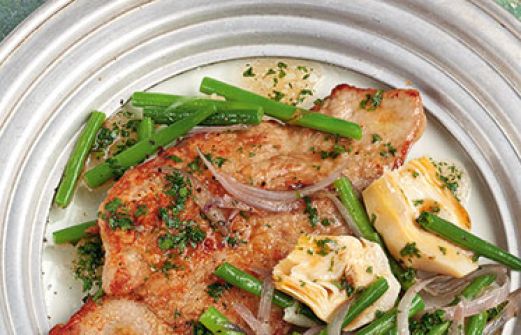 Kalbsschnitzel mit Artischocken Zutaten 200 g grüne Bohnen Salz 1 Dose Artischockenherzen (ca. 240 g) 2 Schalotten 3 EL Olivenöl 2 Kalbsschnitzel (à 130 g) Pfeffer 1-2 EL Mehl 100 ml Kalbsfond 1 EL TK-Petersilie guk:similarity-keywords=""> 200 g grüne Bohnen , [...]