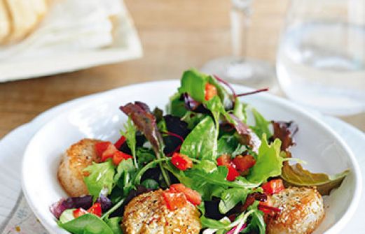 Blattsalat mit Jakobsmuscheln Zutaten 150 g gemischter Schnittsalat 2 Strauchtomaten 3 EL Weißweinessig Salz Pfeffer Zucker 6 EL Olivenöl 12 küchenfertig ausgelöste Jakobsmuscheln 1 EL helle Sesamsamen 1 EL neutrales Pflanzenöl 1 EL Butter Salz Pfeffer guk:similarit [...]