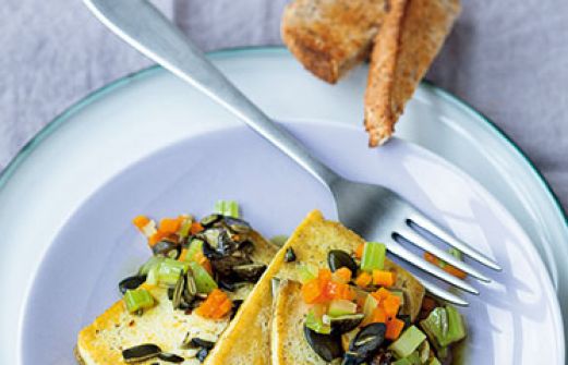 Gebratener Tofu mit Kürbiskernen Zutaten 3 Stangen Sellerie 2 Möhren 100 ml Gemüsebrühe 250 g Tofu 40 g Kürbiskerne 1 EL Sonnenblumenöl Salz Pfeffer 3 EL Kürbiskernöl 4 Scheiben Vollkorntoast 2 frische Knoblauchzehen guk:similarity-keywords=""> 3 Stangen Sellerie , [...]