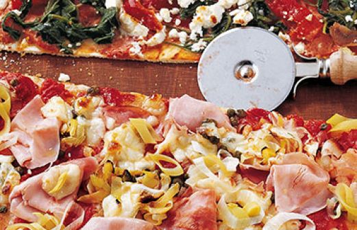 Pizza mit Lauch und Schinken Zutaten 2 ausgerollte Pizzateige (rund, ersatzweise 1 rechteckiger; aus dem Kühlregal) 1 Knoblauchzehe 200 g Pizzatomaten (aus der Dose oder der Packung) 1 EL Kapern Salz Pfeffer, frisch gemahlen 1 Prise Zucker 150 g gekochter Schinken in dünnen Sche [...]