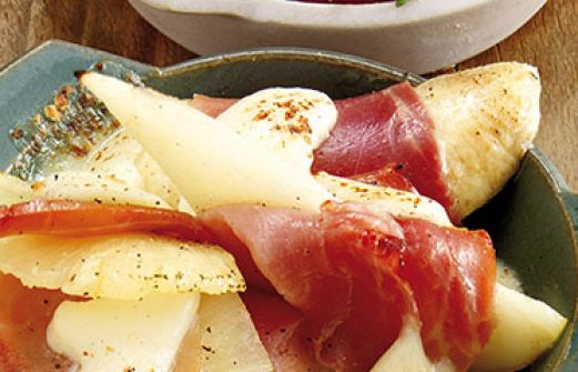 Obst im Schinken-Mantel Zutaten 1 Banane 2 Ananasringe (aus der Dose) 1 reife Birne (z. B. Abate Fetel oder Packham) 20 kleine, hauchdünne Scheiben geräucherter Schinken 250 g Mozzarella guk:similarity-keywords=""> 1 Banane , 2 Ananasringe (aus der Dose) , 1 re [...]
