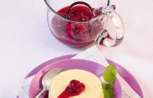 Vanille-Grieß-Flammeri mit Kirschen Zutaten 20 g Speisestärke 2 Eigelb 450 ml Vollmilch 50 g Zucker 20 g Hartweizengrieß Mark von 1/2 Vanilleschote Salz 2 Blätter weiße Gelatine 1 Eiweiß 100 g Sahne 200 g Kirschgrütze (Fertigprodukt; aus dem Kühlregal) 4 Dessertringe (8 cm [...]