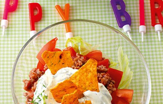 Schichtsalat Zutaten 1 EL Öl 250 g Hackfleisch ½ kleiner Eissalat 2 Tomaten Salz Pfeffer 3 EL mexikanische Salsa (Fertigprodukt; Flasche) 2 EL Ketchup ½ Bund frische Kräuter (z. B. Schnittlauch) 200 g saure Sahne 50 g Tortillachips guk:similarity-keywords=""> 1 EL Ö [...]