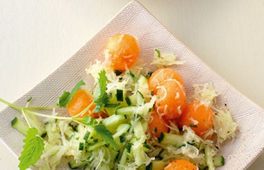 Kohlrabi-Melonen-Salat Zutaten 1 kleiner junger Kohlrabi 1/2 Salatgurke 1/2 kleine Cantaloupe-Melone 1 EL heller Balsamico-Essig 1 EL trockener Sherry 1/2 TL Zucker Jodsalz Pfeffer 1 EL Traubenkernöl 2 EL Gemüsebrühe 3 Zweige Zitronenmelisse guk:similarity-keywords=""> [...]
