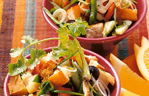 Brotsalat Zutaten 1 Sesam-Fladenbrot 2 Tomaten 1 kleine Salatgurke (ca. 150 g) 1 grüne Paprikaschote 1 Bund Frühlingszwiebeln je 1/4 Bund Koriandergrün und Petersilie 2 Knoblauchzehen 4 EL Zitronensaft 6 EL Olivenöl Salz Pfeffer 1 Prise gemahlener Koriander 2 EL schwarz [...]