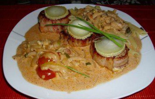 zutaten_2sp"> Zutaten für Personen Rezept mit Bild: Medaillons gratiniert Bild einstellen 4 Schweinemedaillons 1 Packung Frühstücksbacon 1 Ziegenkäserolle 1 Becher Schlagsahne 1 Knoblauchzehe 1 Ro [...]