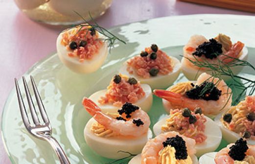 Gefüllte Eier auf leichte Art Zutaten 12 Eier (Größe S) 4 EL Doppelrahm-Frischkäse 50 g Joghurt 2 TL scharfer Senf Salz schwarzer Pfeffer 12 geschälte gekochte Garnelen 1 kleines Glas Kaviar (50 g) 1/2 Bund Dill 1 dünne Scheibe gekochter Schinken (ca. 25 g) 1 TL kleine Kaper [...]