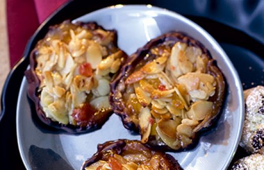 Florentiner Zutaten 100 g kandierte Früchte (z. B. Aprikosen, Feigen, Pfirsiche, Kirschen, Birnen, Quitten) 150 g Sahne 50 g Butter 100 g Zucker 1 Pck. Vanillezucker 1 Msp. Zimtpulver 3 Tropfen Bittermandelöl 2 EL Honig 200 g Mandelblättchen 2 EL Mehl 100 g Zartbitterschokol [...]