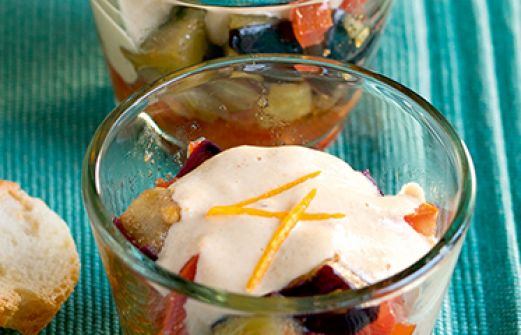 Auberginensalat mit Sesam-Orangen-Creme Zutaten 1 Aubergine (ca. 400 g) Salz 2 Knoblauchzehen 150 g Crème fraîche 3 EL Tahina (Sesampaste aus dem Asienladen) 60 ml frisch gepresster Orangensaft abgeriebene Schale von ½ Bio-Orange Cayennepfeffer 2 reife Tomaten (ca. 200 g) 4 EL [...]
