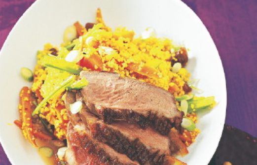 Koriander-Entenbrust mit Couscous Zutaten 3 Entenbrustfilets (á ca. 300 g) Salz frisch gemahlener schwarzer Pfeffer Koriander (gemahlen) 1 Glas Entenfond (500 ml) 2-3 EL Soßenbinder (dunkel) ca. 1 EL Orangenmarmelade 1 Bund Lauchzwiebeln (6 Stück) je 200 g Möhren und Staudensel [...]