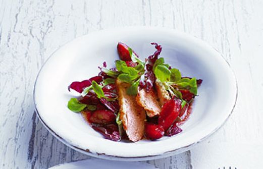Zwetschgen-Entenbrust-Salat Zutaten 300 g Zwetschgen 100 ml Portwein 5 EL Rotweinessig 1 EL Zucker 1 Sternanis 1 Entenbrustfilet (etwa 300 g) Salz Pfeffer 400 g Feldsalat 1 kleiner Radicchio 2 EL Johannisbeergelee 3 EL Traubenkernöl guk:similarity-keywords=""> 300 [...]