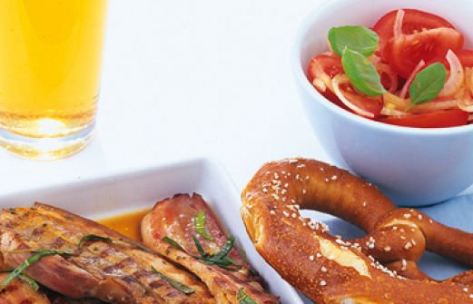 Speck und Schweinebauch vom Grill Zutaten 4 Scheiben durchwachsener Räucherspeck (je etwa 1 cm dick) 4 Scheiben frischer Schweinebauch (je etwa 1 1/2 cm dick) 1 Stück in Sirup eingelegter Ingwer (etwa 2 cm, aus dem Glas) 4 Zitronenblätter 1 EL grüne Pfefferkörner (frisch oder aus d [...]