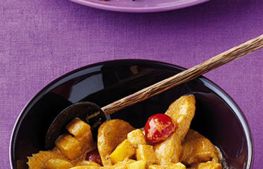 Hähnchencurry mit Ananas Zutaten 400 g Hähnchenbrustfilet ohne Haut 300 g Staudensellerie 150 g Kirschtomaten 150 g Ananasfruchtfleisch 2 EL Maiskeimöl 1 EL rote Currypaste 250 ml Hühnerbrühe 250 g Joghurt (3,5 % Fett) 5 EL Magermilchpulver 2 TL Speisestärke 4 EL helle Sojas [...]