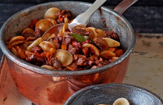 Orecchiette mit Wildschwein-Ragout Zutaten 800 g Wildschweinkeule oder -schulter 2 kleine Zwiebeln 3 Knoblauchzehen 1 Möhre 250 g Steckrübe 1 TL schwarze Pfefferkörner 1 TL Wacholderbeeren 2 Zweige Rosmarin 1 Lorbeerblatt 80 g Räucherspeck 135 g passierte Tomaten (aus d [...]