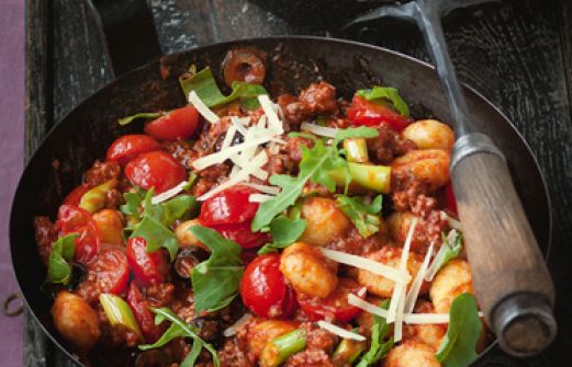 Gnocchi-Tomaten-Pfanne Zutaten 1 Knoblauchzehe 1 Bund Frühlingszwiebeln 250 g Kirschtomaten 1 Bund Rucola 60 g schwarze Oliven (ohne Stein) 3 EL Olivenöl 400 g Rinderhackfleisch 2 TL getrockneter Oregano Salz Pfeffer 500 g passierte Tomaten (aus dem Tetrapack) 800 g fri [...]