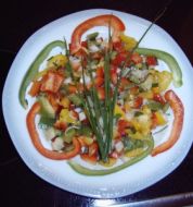 Menge Zutat 2 St rote Paprikaschoten 2 St gelbe Paprikaschoten 2 St grüne Paprikaschoten 1 St rote Chilischote 2 St Gemüsezwiebeln 400 [...]