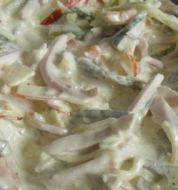 zutaten_2sp"> Zutaten für Personen Rezept mit Bild: Fleischsalat pikant mit Meerrettich-Dressing Bild einstellen 400 gr Lyoner Wurst oder Mortadella 1 Zwiebel 3 Gewürzgurken 0.5 Kohlrabi frisch 1 Apf [...]