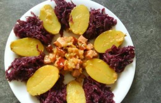 Zutaten für Personen Rezept mit Bild: Kassler Lachs Bild einstellen 120 g Kassler Lachs 200 g Kartoffeln festkochend 200 g Rotkohl (Blaukraut) gegart 12 g Butter gesalzen 30 g Schalotten frisch Salz [...]